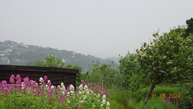 The last work-day of the week, the last week of the month and the last month of spring, and enough politics! Tomorrow will be the first day of the summer. Will the weather be better? I hope. Today there is a cold northerly wind and I can hardly see the sea. The world - sea, sky, plants - is cold "glas". But there are hotter colours in the flowers. There is gold and red on little goldfinches, and more red on this red admiral butterfly. And the day was brighter with visitors - my family and their new dog. My little dog is delighted with his big new friend.